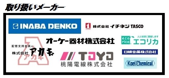 因幡電器産業(イナバ・因幡電工)/日晴金属(キャッチャー)/イチネンTASCO/アカギ/桃陽電線/ダイキン/三菱電機/三菱重工/日立/エコリカ など